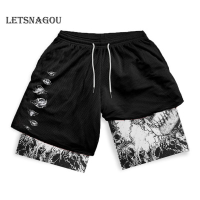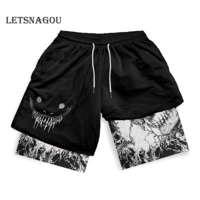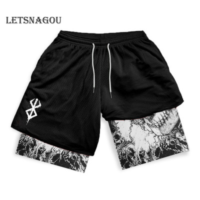 شورت ضغط بطبقة مزدوجة للرجال بطباعة أنيمي ، شورت أداء ، جيد التهوية ، سريع الجفاف ، مرن ، تمرين ، 2 في 1