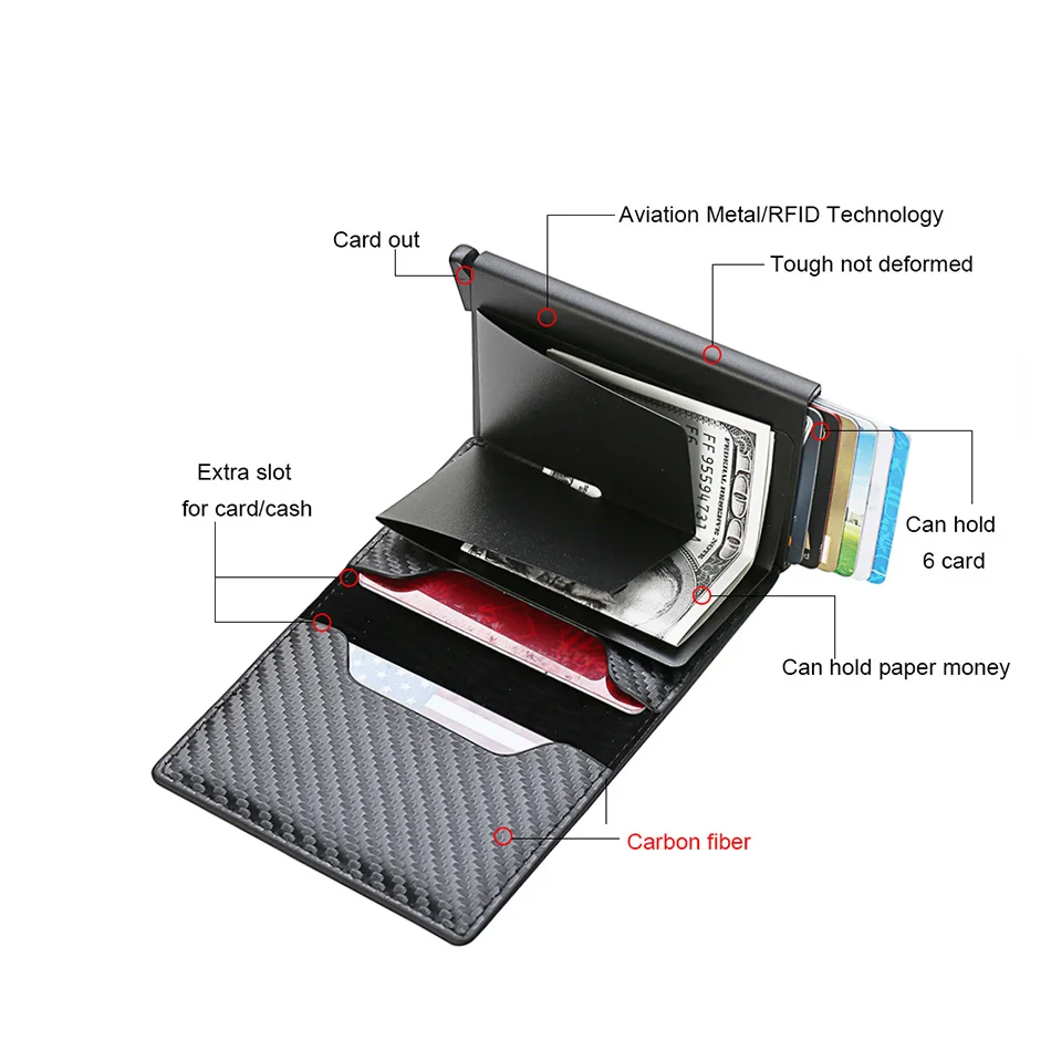 • الألومنيوم والكربون: منمصنوعة من الألومنيوم المتين وألياف الكربون ، هذه المحفظة للرجال RFID توفر مظهرًا أنيقًا وعصريًا مع ضمان الاستخدام طويل الأمد.