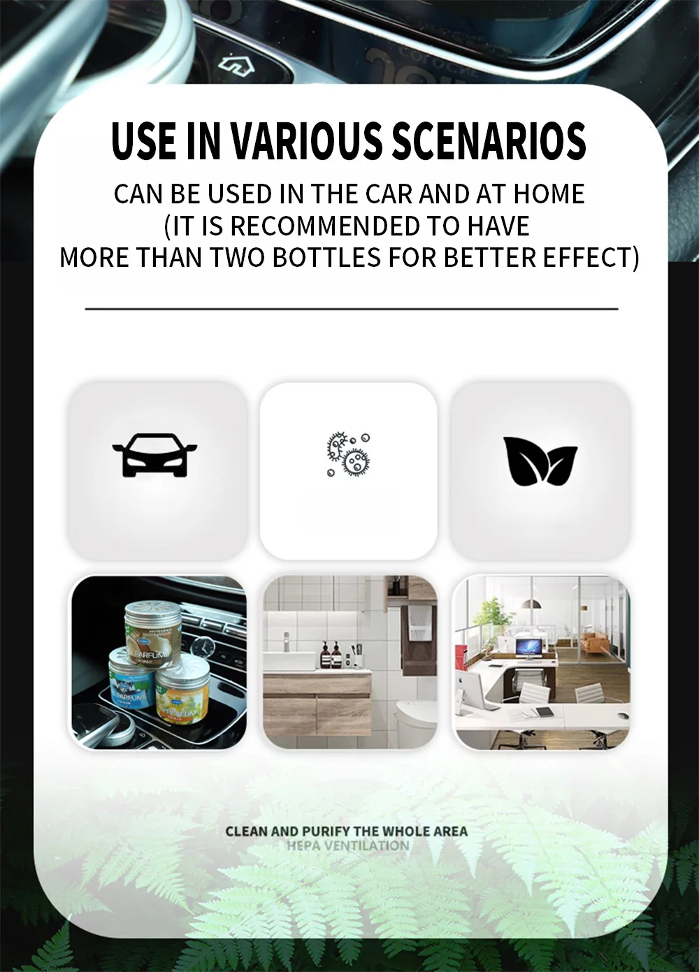 كما يمكنه التخلص من الروائح الكريهة وإنعاش الهواء بشكل فعال. إنها مناسبة للمنزل والسيارة والمكتب والمقهى والفندق والمرحاض والصالة والمعرض والعديد من الأماكن الأخرى.